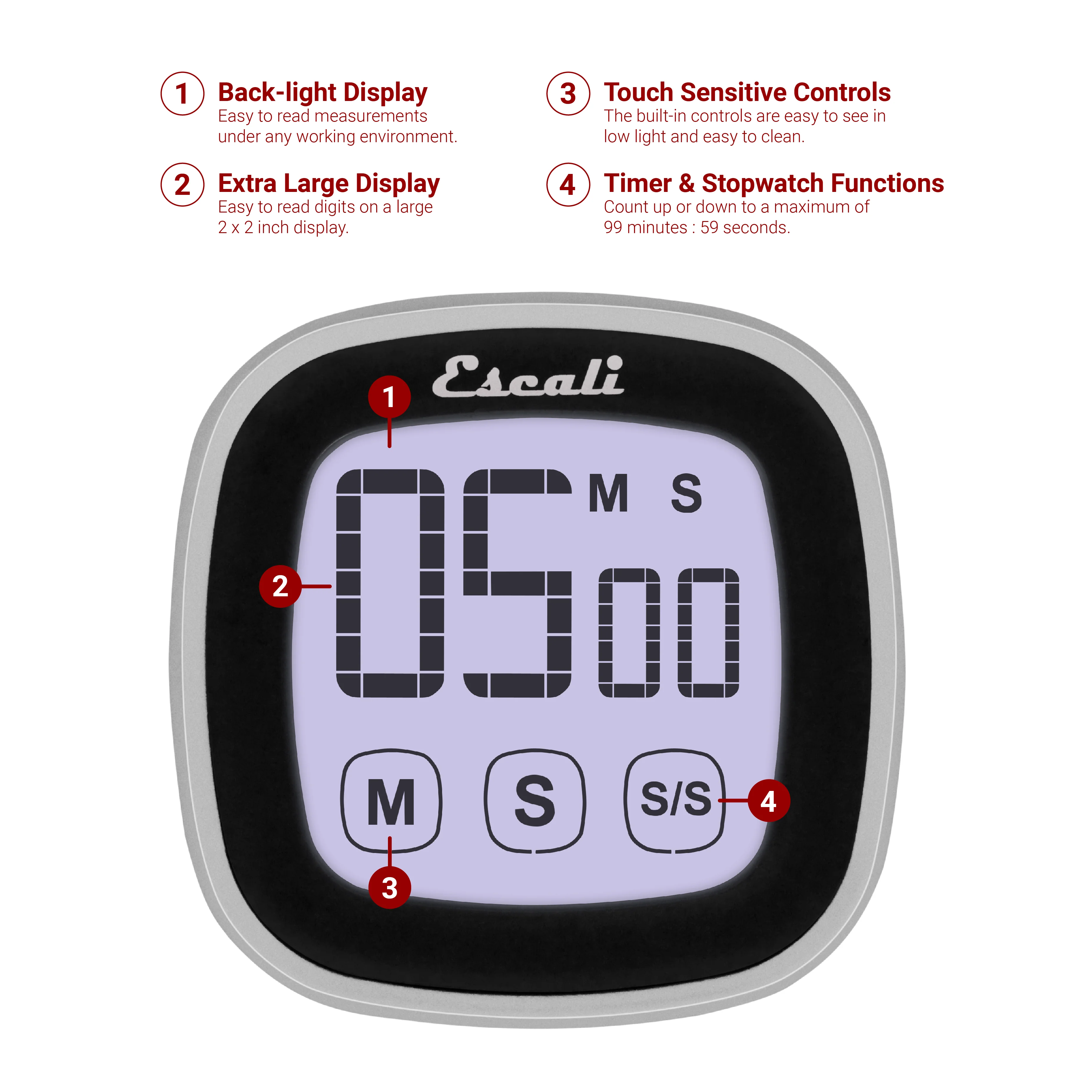 The Escali Touch Screen Digital Timer helps you multitask in the kitchen and features a large back-light display that is easy to read under any lighting condition. Count up or down, and recall previous timer settings for repetitive tasks. Available in a selection of color combinations.